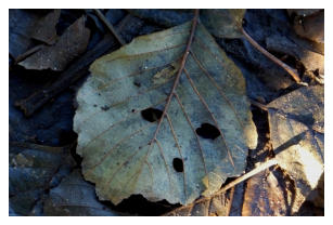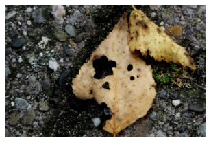 BlattgesichterDie Motive sind von mir nicht mechanisch manipuliert. Durch Insektenfraß und andere natürliche Veränderungen bearbeitet, lagen die abgebildeten Blätter bei Spaziergängen quasi vor meinen Füßen. Eine größere Darstellung der Motive würde Details der Strukturen hervorheben und den jeweiligen “Gesichtsausdruck” in den Hintergrund drängen.Herbst 2014