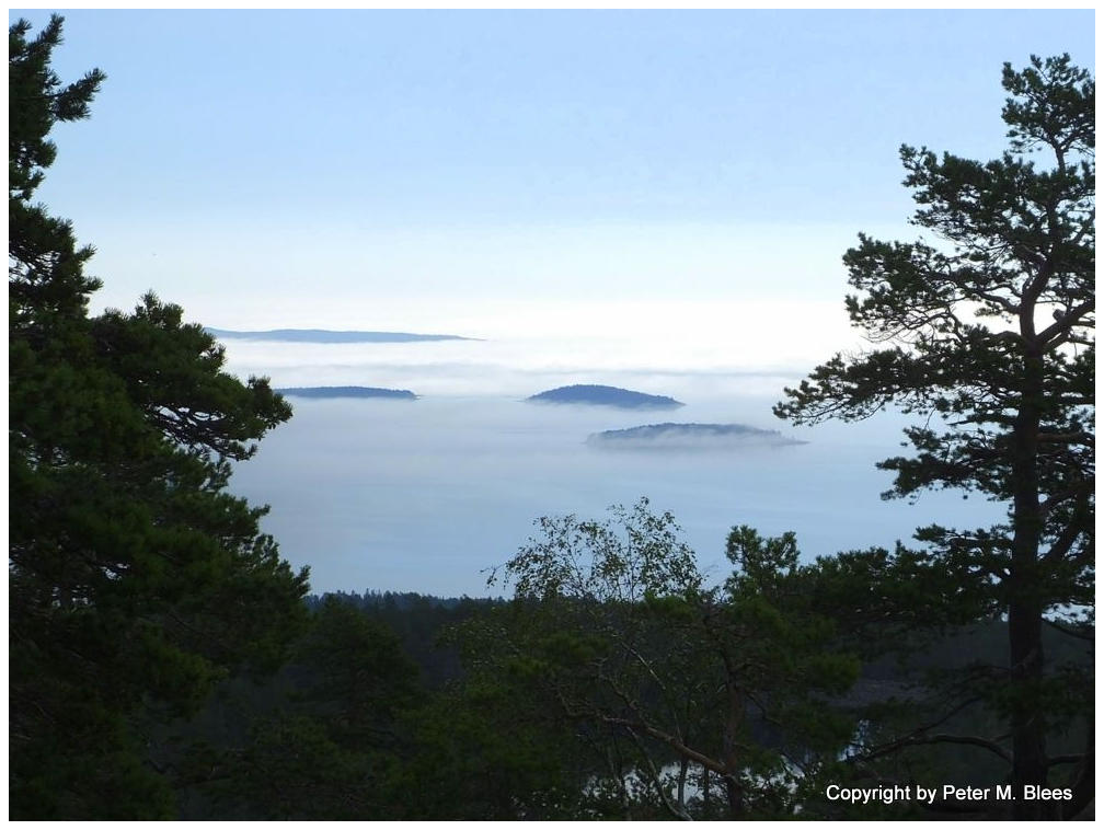 Morgennebel liegt über der Ostsee, bewaldete Inseln ragen aus dem Dunst.