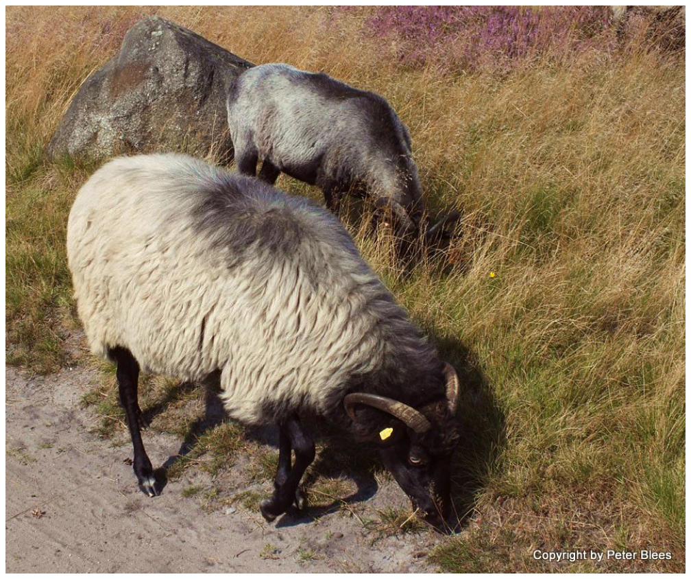 Der Pastor Bode Weg (von Döhle nach Wilsede)Heidschnucken haben meistens den Kopf unten, weil sie Gräser, Kräuter und Heide fressen. Das besondere der Heidschnucken ist die graue Wolle, das übrige Fell an Kopf und Beinen ist Pechschwarz, manchmal schimmern aber auch dunkle Brauntöne darin.