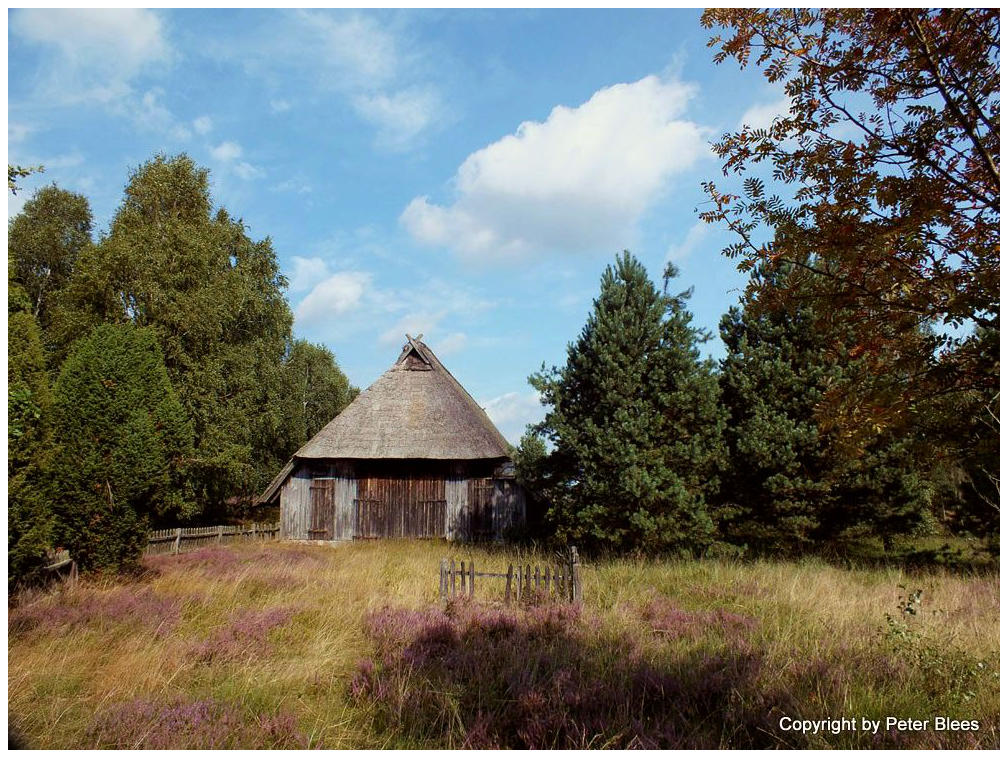 Ein mit Reet gedeckter Schafstall steht am Wegesrand.