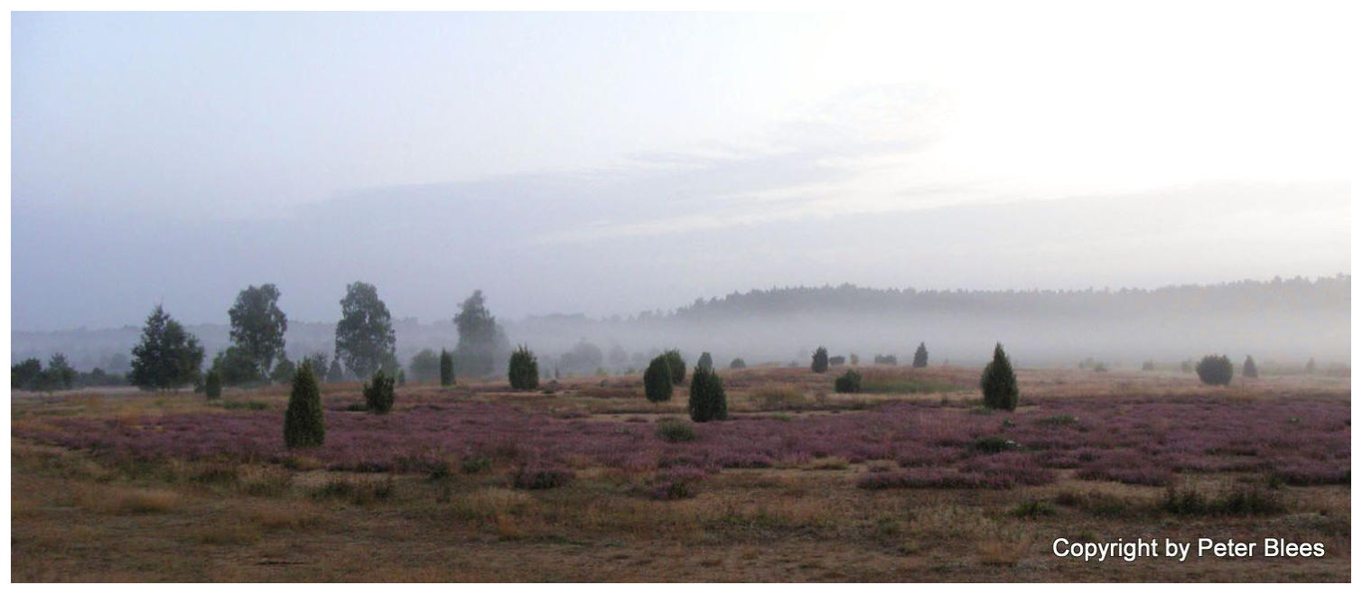 Die Ellerndorfer Heide Im Morgendunst ohne Sonne erscheint die Heide fast farblos. Hier habe ich eine Aufnahme zum Panorama beschnitten, weil das gesamte Foto lange nicht so interessant wie dieser Ausschnitt wäre.Die Aufnahme entstand am 17. August 2012 um 6:01 Uhr.
