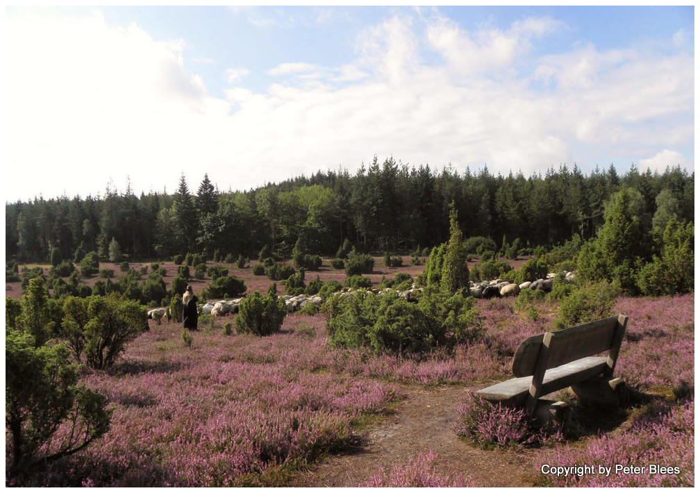 Die Ellerndorfer HeideWenn man Glück hat oder einen Termin abspricht, trifft man auch in der Ellerndorfer Heide eine Schäferin mit ihrer Herde. Die hier besteht aus Heidschnucken, Schafen und Ziegen. Die Tiere fressen zwar auch die Heide, aber ebenso groß ist der Nutzen für die Imker, denn sie zerstören auch die vielen Spinnennetze in denen sich die Honigbienen verfangen könnten.