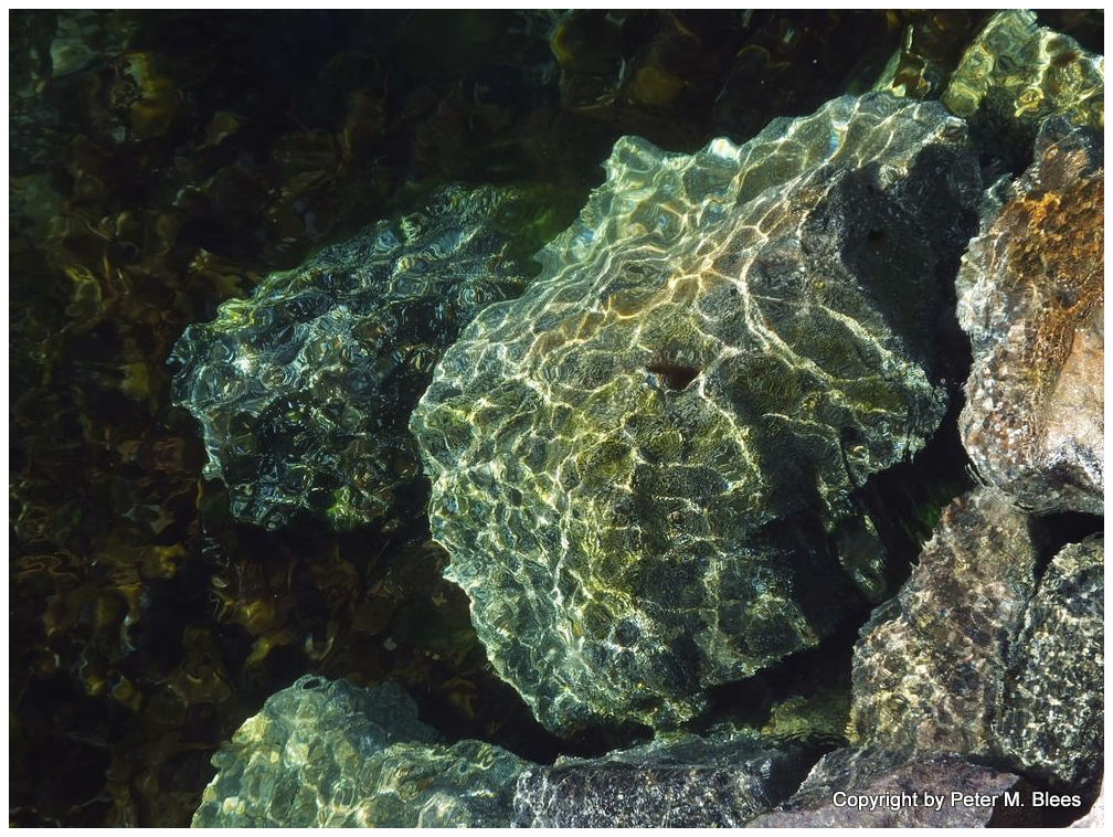 Auf Steinen im klaren Wasser bildet sich durch Lichtbrechung in den Wellen ein