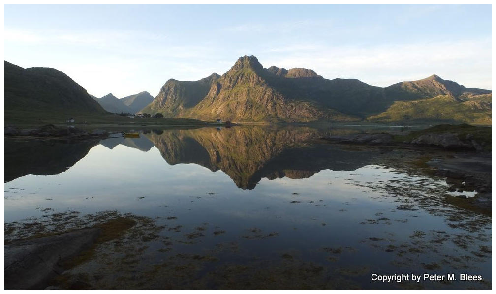 Blick über die Bucht Flakstadpoll auf den Berg Blekktind