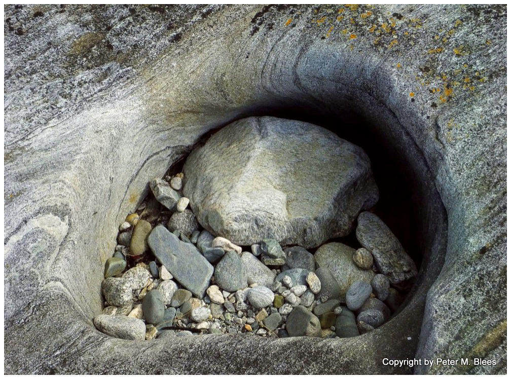 von Wasserstrudeln mit Hilfe von Steinen ausgewaschene runde Löcher, die