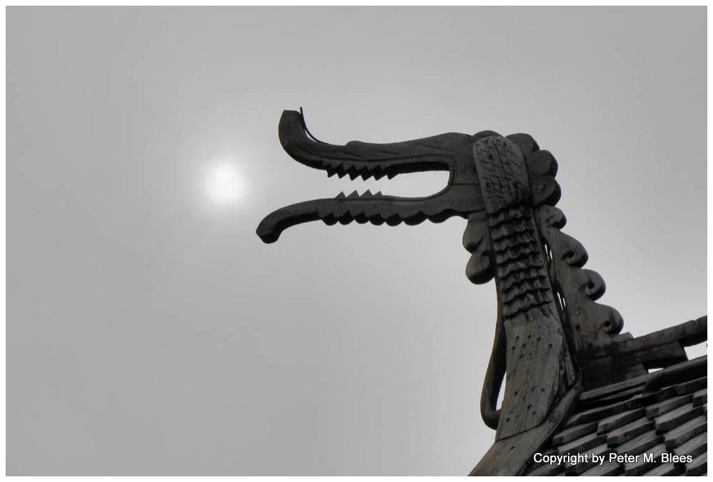 Auch die Stabkirche in Lom ist mit Drachenköpfen und anderen Fabelwesen