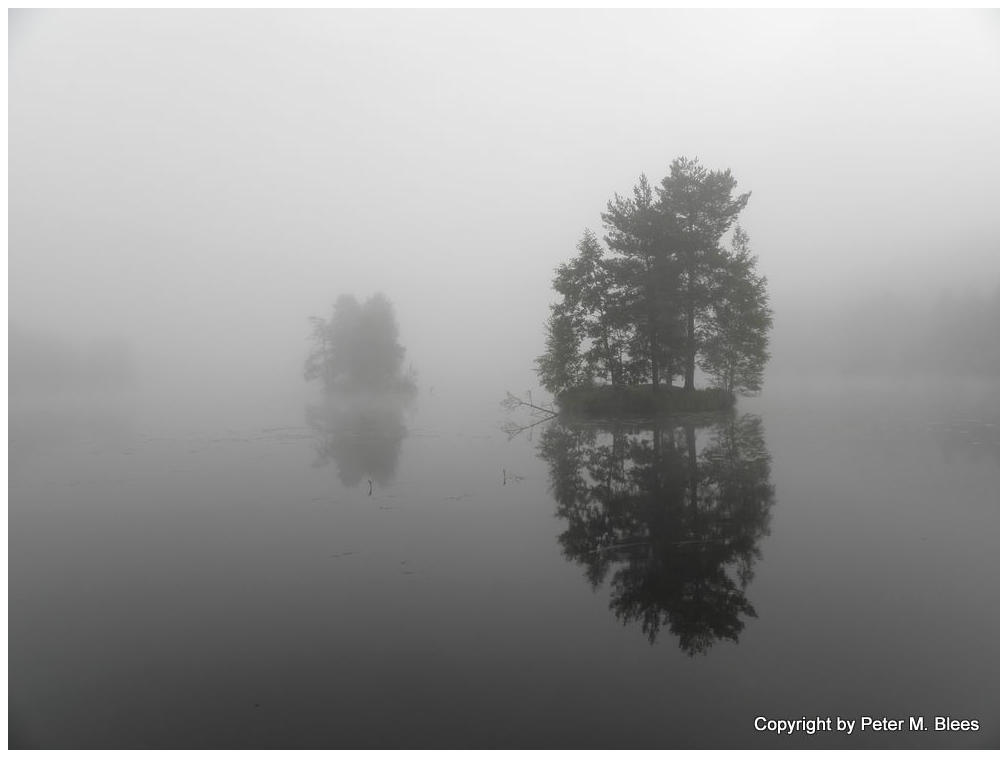 Morgennebel über einem See bei Lesjöfors, Südschweden