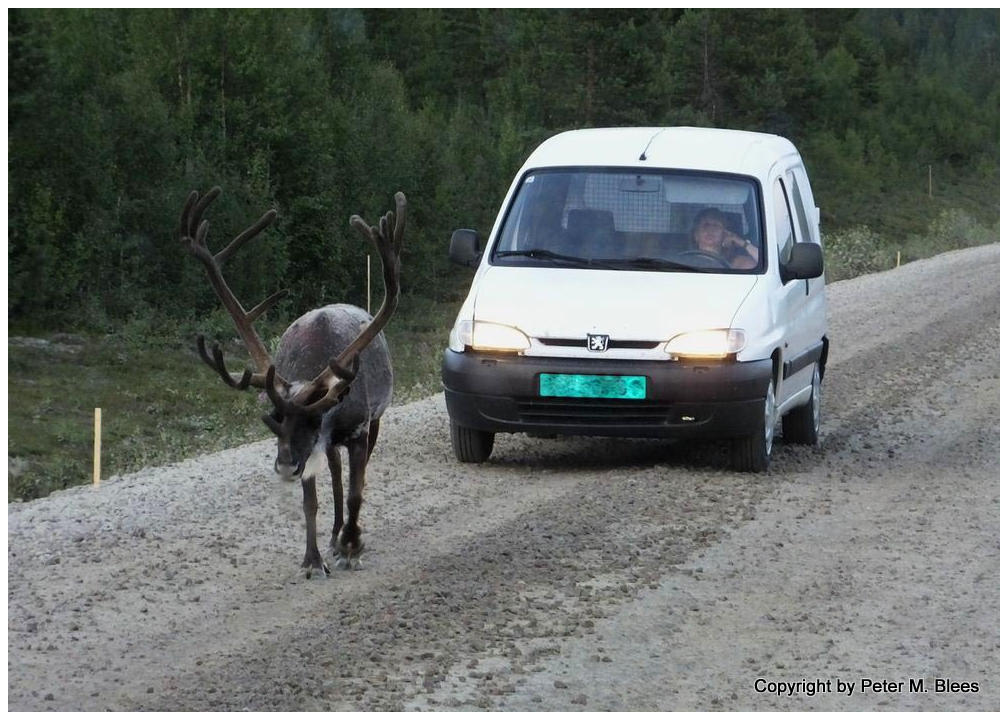 Rentiere „entschleunigen” den Autoverkehr in Nordskandinavien, hier auf dem Silvervägen, NordschwedenAus Datenschutzgründen habe ich das Kennzeichen des Autos unkenntlich gemacht.25. Juli 2014 22:04 UhrFür „entschleunigen” könnte man natürlich auch bremsen schreiben, aber das hört sich negativer an.