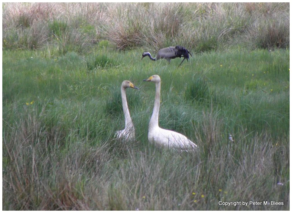 Ein verliebtes Singschwänepaar, im Hintergrund ein Kranich, Südschweden
