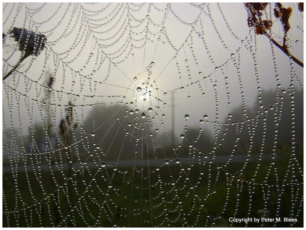 feuchte Morgenluft, die verziert die Spinnennetze mit Tauperlen.