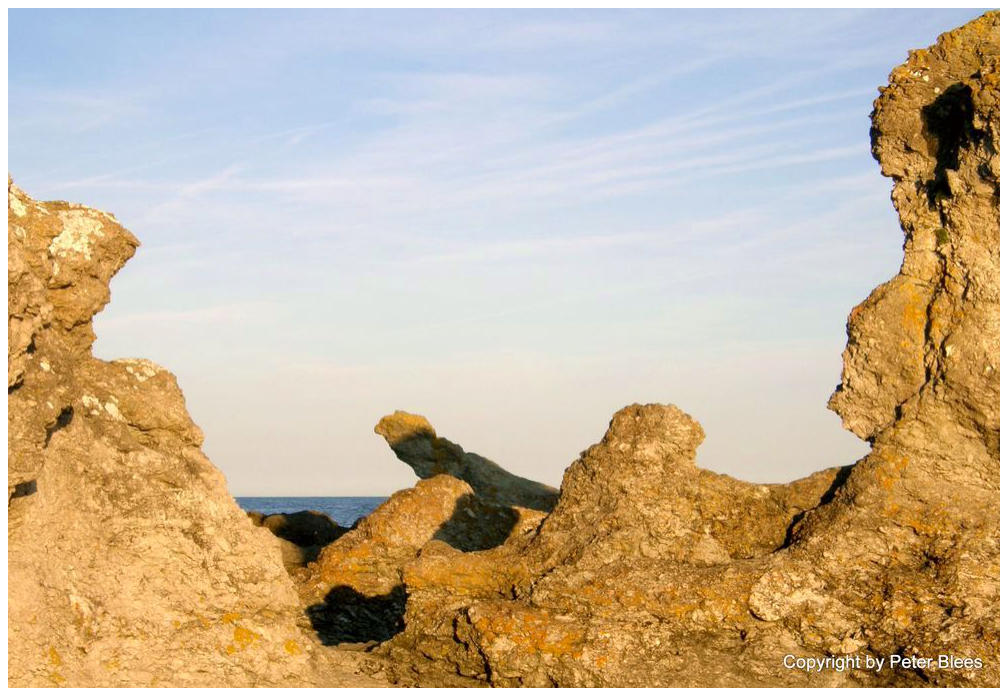 Im Abendlicht und -schatten erscheinen zwei Vögel im Raukgebiet Folhammar.