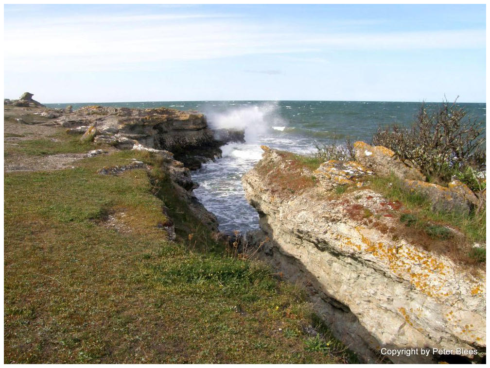 Der Sturm peitscht das Meer am Felsufer mehrere Meter hoch.