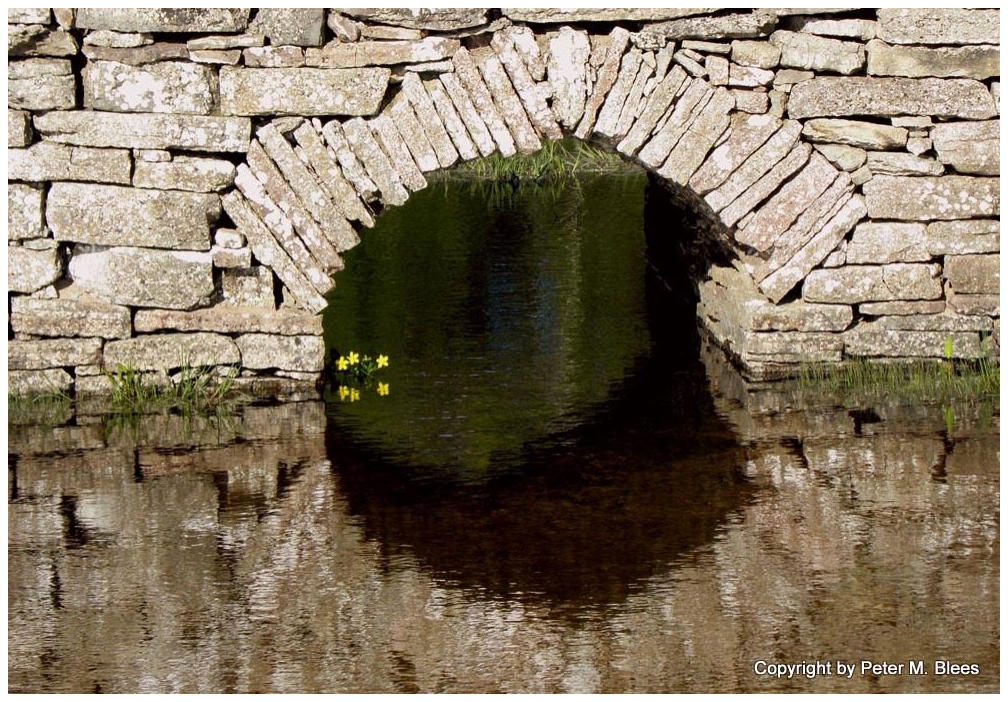 Unter der Brücke wachsen Sunpfdotterblumen und recken ihre Blüten in die