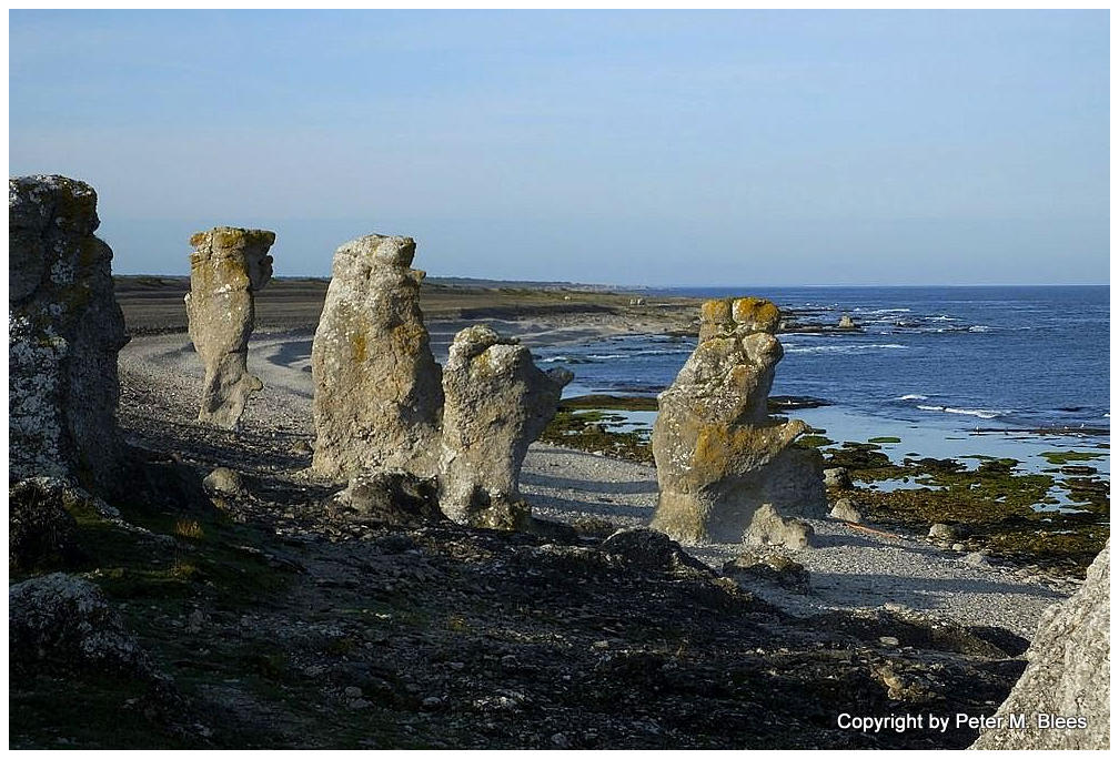 Wie von einem Künstler aufgestellt, stehen die Raukar am Strand in der