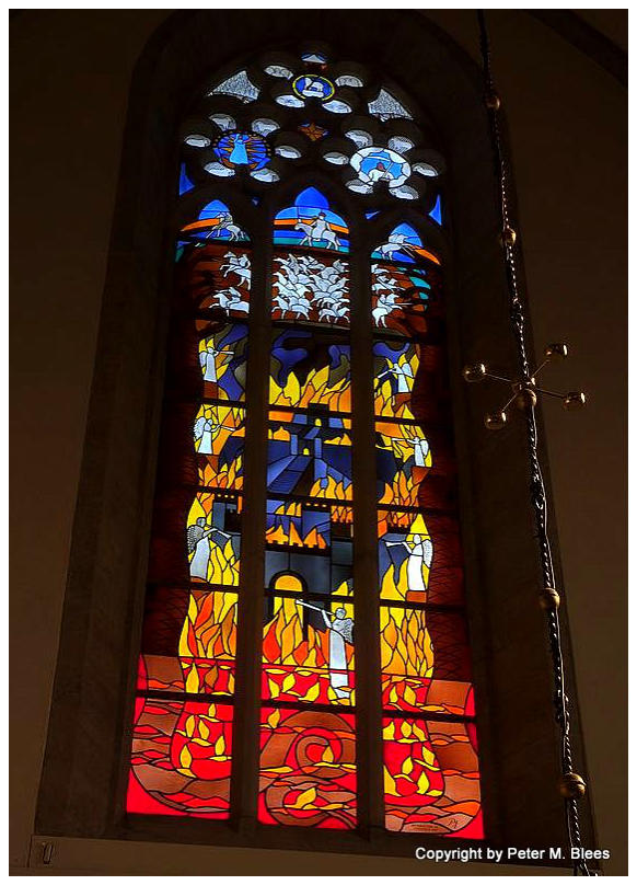 Ein Kirchenfenster des Doms mit der Ansicht der brennenden Altstadt,