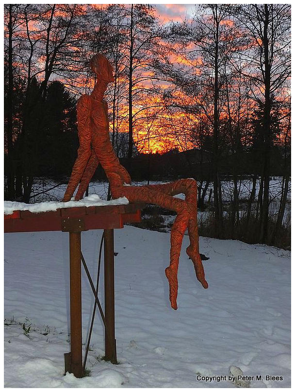 Die “Sitzende” im Schnee mit einem bunten Abendhimmel im Hintergrund.